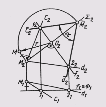 фронталь f Проекция MI совмещения вершины М угла между прямыми с и d находится на проекции Sum 2 фронтально проецирующей плоскости Sum, в которой вращается точка М. Определив с помощью прямоугольного треугольника О2М2М натуральную величину радиуса вращения r и отложив ее на проекции Е2 от фронтальной проекции центра вращения, получаем изображение точки М на плоскости П2в совмещенном с плоскостью Ф положении. Соединяя фронтальные проекции неподвижных точек 1 и 2 с построенной точкой М, получаем проекции с2 и d2, совмещенных с плоскостью Ф прямых с и d. Угол между прямыми с2 и d2 определяет натуральную величину искомого угла между пересекающимися прямыми с и d.