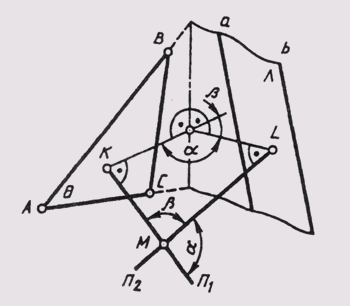 угла а и Р, которые соответственно равны линейным углам двух смежных углов (двугранных), образованных плоскостями q и л,. Определив истинную величину углов между перпендикулярными n1 и n2 путем вращения вокруг прямой уровня, тем самым определим и линейный угол двугранного угла, образованного плоскостями q и л.