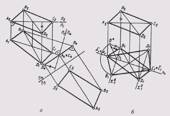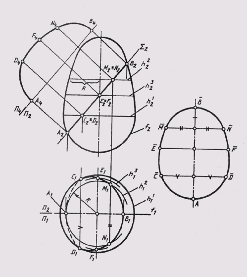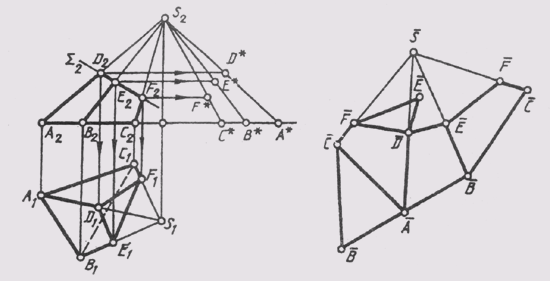 Для нанесения на развертку точек D, Е и F, соответствующих вершинам сечения пирамиды плоскостью Sum, нужно определить истинные расстояния этих точек от вершины S. После построения развертки боковой грани поверхности усеченной части пирамиды нужно пристроить к ней треугольники АBС и DEF, дающие истинную величину основания и сечения пирамиды.
