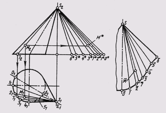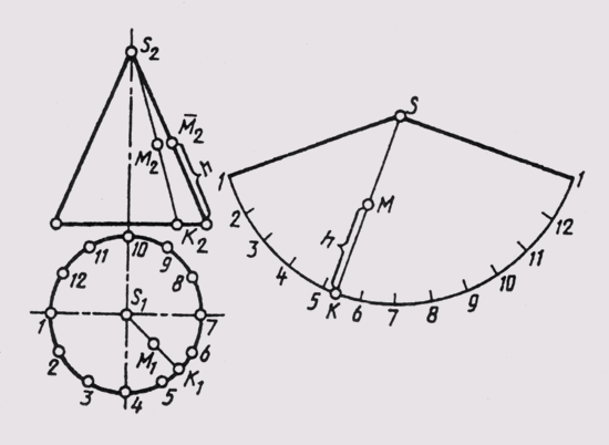 На рис. 151 приведен пример построения развертки прямого кругового конуса. Для построения ее используем то, что очерковая образующая конуса l на фронтальной плоскости изобразилась в натуральную величину. Выбрав положение вершины развертки — точку S, радиусом L проводим дугу и откладываем на ней 12 равных частей, на которые предварительно разделили окружность основания конуса, изображенного на горизонтальной плоскости проекции в натуральную величину. Чем на большее количество равных участков разделим окружность, тем точнее построим развертку. Положение точки М на развертке поверхности конуса определим следующим образом: через фронтальную проекцию точки проведем образующую и построим горизонтальную ее проекцию. Найдем, что образующая пересекла основание конуса между точками 5 и 6. Точку К переносим на дугу развертки, расположив ее между точками 5 и 6, и соединим с вершиной конуса развертки S. Из точки M2 проведем горизонтальную линию до пересечения с очерковой образующей L и получим точку M2. Расстояние от основания конуса до точки M2 по образующей является высотой точки, которую откладываем на развертке от точки К на линии KS. Полученная точка определит истинное положение точки M на развертке. Таким образом, развертку конической поверхности построим с помощью соседних точек окружности основания, в которую вписан правильный двенадцатиугольник, т. е. коническая поверхность условно заменена поверхностью, вписанной правильной двенадцатиугольной пирамидой, а для построения развертки применен способ триангуляции.