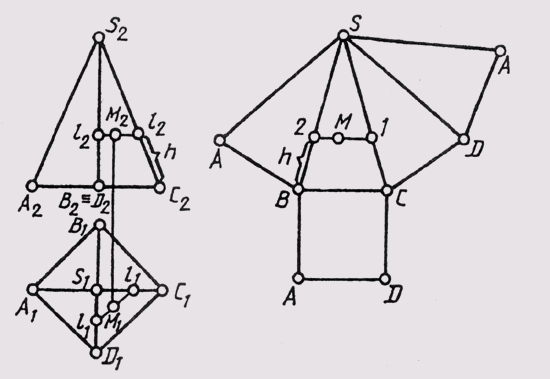 роны равны истинным величинам образующих, а третья — хорде, стягивающей дугу окружности основания между соседними точками деления. Построенные на развертке точки О, 1, 2,... соединяются. Построение развертки значительно упрощается, если поверхность представлена прямой пирамидой правильной формы или прямым круговым конусом. На рис. 150 приведена развертка четырехгранной прямой пирамиды. Построение ее упрощается тем, что образующая пирамиды AS и CS параллельны фронтальной плоскости проекций и на нее спроецировались в натуральную величину. Основание же пирамиды ABCD лежит в плоскости, параллельной горизонтальной плоскости проекций, и на нее проецируется в натуральную величину. Для построения развертки достаточно построить сторону AS и сделать засечки радиусом дуги, равным BS и АВ из точек S и А, соответственно получим точку В и т. д. Основание же в натуральную величину можно построить на базе одной из его сторон (на рис. 150 — на базе стороны АВ). Положение точки на поверхности развертки пирамиды определим в следующем порядке: через фронтальную проекцию точки М (М2) проведем горизонтальную линию до пересечения с ребрами A2S2 и B2S2. Получим точки 11 и 22. На линии AS развертки от точки А отложим отрезок h и из полученной точки 1 проведем линию 1, 2 параллельно AD на которой нанесем точку М в том положении, которое она занимает на горизонтальной проекции линии 1, 2.