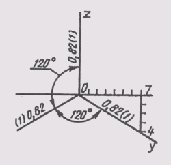 Прямоугольная изометрия характеризуется тем, что коэффициенты искажения составляют 0,82. Их получают из соотношения (1).