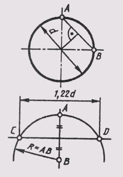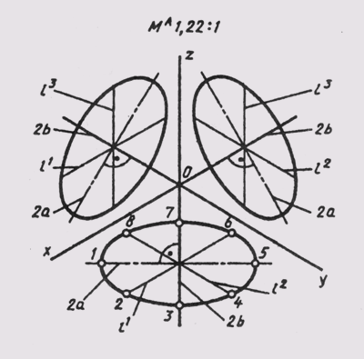 Размеры осей эллипсов при использовании приведенных коэффициентов искажения равны: большая ось 2а= 1,22d, малая ось 2b = 0,71d, где d — диаметр изображаемой окружности.