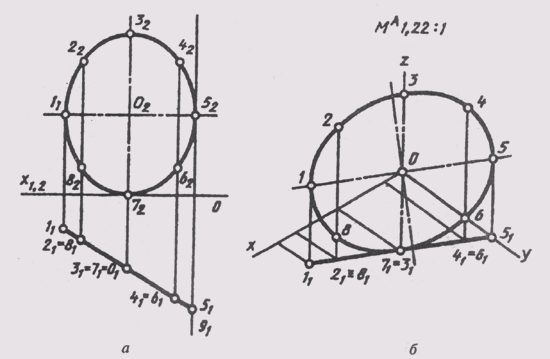 На окружности, расположенной в горизонтально проецирующей плоскости, взято 8 точек (1,2,... 8). Сама окружность отнесена к натуральной системе координат (рис. 160, а).Проводим оси эллипса прямоугольной изометрии и, используя приведенные коэффициенты искажения, строим вторичную проекцию окружности 11 1,..., 511 по координатам х и у (рис. 160, б). Достраивая аксонометрические координатные ломаные для каждой из восьми точек, получаем их изометрию (11, 21,... 81). Соединяем плавной кривой изометрические проекции всех точек и получаем изометрию заданной окружности.