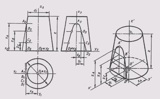 Изображение геометрических поверхностей в прямоугольной изометрии рассмотрим на примере построения стандартной прямоугольной изометрии усеченного прямого кругового конуса (рис. 161).