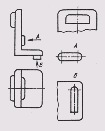 Если местный вид расположен в непосредственной проекционной связи с соответствующими изображениями, то его не обозначают. В остальных случаях местные виды обозначаются подобно видам дополнительным, местный вид может быть ограничен линией обрыва («Б» на рис. 169).