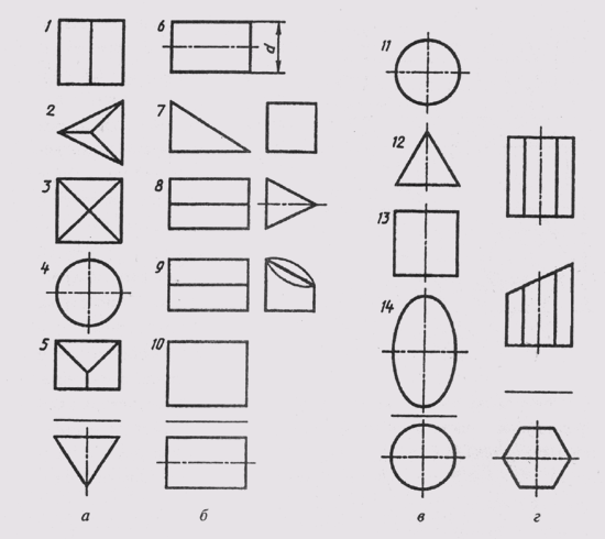 Изображение в виде четырехугольника (квадрата) могут иметь на виде сверху (рис. 170, б): цилиндр вращения 6, треугольная призма 8, четырехугольные призмы 7 и 10, а также другие предметы, ограниченные плоскостями или цилиндрическими поверхностями 9.