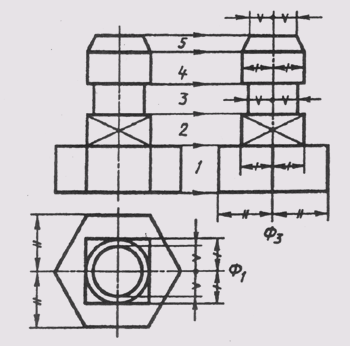 Сопоставив оба изображения, устанавливаем, что поверхность предмета включает в себя поверхности: правильной шестиугольной 1 и четырехугольной 2 призм, двух цилиндров 3 и 4 вращения и усеченного конуса 5 вращения. Предмет имеет фронтальную плоскость симметрии Ф,которую удобно принять за базу отчета размеров по ширине отдельных частей предмета при построении его вида слева. Высоты отдельных участков предмета отсчитываются от нижнего основания предмета и контролируются горизонтальными линиями связи.