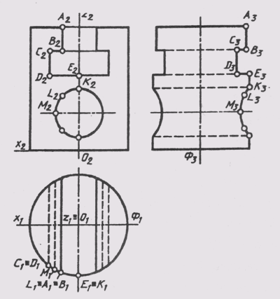 На рис. 172 построен вид слева предмета, поверхность которого образована поверхностью вертикального цилиндра вращения, с T-образным вырезом в его верхней части и цилиндрическим отверстием с фронтально проецирующей поверхностью. В качестве базовых плоскостей взяты плоскость нижнего основания и фронтальная плоскость симметрии Ф. Изображение Г-образного выреза на виде слева построено с помощью точек контура выреза A В, С, D и Е, а линия пересечения цилиндрических поверхностей — с помощью точек К, L, М и им симметричных. При построении третьего вида учтена симметрия предмета относительно плоскости Ф.