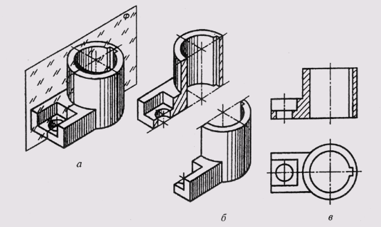 Чтобы выполнить разрез, необходимо: в нужном месте предмета мысленно провести секущую плоскость (рис. 173, а); часть предмета, находящегося между наблюдателем и секущей плоскостью, мысленно отбросить (рис. 173, б), оставшуюся часть предмета проецировать на соответствующую плоскость проекций, изображение выполнить или на месте соответствующего вида, или на свободном поле чертежа (рис. 173, в); плоскую фигуру, лежащую в секущей плоскости, заштриховать; при необходимости дать обозначение разреза.