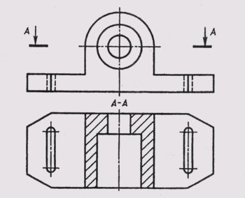 Если секущая плоскость совпадает с плоскостью симметрии предмета, а разрез выполнен на месте соответствующего вида в проекционной связи и не разделен каким-либо другим изображением, то для горизонтальных, вертикальных и профильных разрезов отмечать положение секущей плоскости не нужно и разрез надписью не сопровождать. На рис. 173 фронтальный разрез не обозначен.