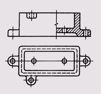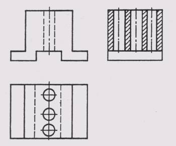 На этом же рисунке на главном виде выполнен местный разрез, показывающий сквозные цилиндрические отверстия на основании детали.