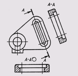 На рис. 177 выполнен вертикальный разрез «А — А», полученный секущей плоскостью, не параллельной ни фронтальной, ни профильной плоскостям проекций. Такие разрезы можно строить в соответствии с направлением, указанным стрелками (рис. 177), или располагать в любом удобном месте чертежа, а также с поворотом до положения, соответствующего принятому для данного предмета на главном изображении. В этом случае в обозначение разреза добавляется знак O.