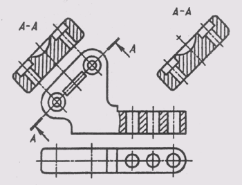 первой. Вместе с секущей плоскостью поворачивают и расположенную в ней фигуру сечения и разрез выполняют в повернутом положении фигуры сечения.