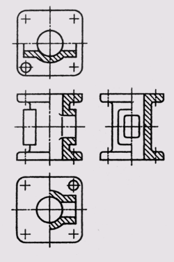 Если соединяются половина вида и половина разреза, каждый из которых является фигурой симметричной, то разделяющей их линией служит ось симметрии. На рис. 182 выполнены четыре изображения детали, причем на каждом из них половина вида соединена с половиной соответствующего разреза. На главном виде и виде слева разрез располагают справа от вертикальной оси симметрии, а на видах сверху и снизу — справа от вертикальной или снизу от горизонтальной оси симметрии.