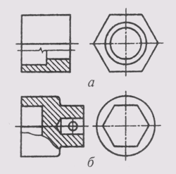 Фронтальный разрез предмета (рис. 185, б) выполняется фронтальной плоскостью симметрии предмета и вычерчен на месте главного вида, а профильный разрез — профильной плоскостью симметрией предмета, поэтому ни тот, ни другой обозначать не нужно. Вид слева и профильный разрез представляют собой симметричные фигуры, их половины можно было бы разграничить осью симметрии, если бы не изображение ребра шестигранного отверстия, совпадающего с осевой линией. Поэтому отделяем часть вида слева от профильного разреза волнистой линией, изображая большую часть разреза.