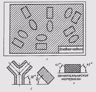Штриховка фигуры сечения, входящей в разрез, должна выполняться согласно ГОСТ 2.306—68. Цветные, черные металлы и их сплавы обозначают в сечении штриховкой сплошными тонкими линиями толщиной от S/3 до S/2, которые проводят параллельно между собой под углом 45° к линиям рамки чертежа (рис. 184, а). Линии штриховки можно наносить с наклоном влево или вправо, но в одну и ту же сторону на всех изображениях одной и той же детали. Если линии штриховки проведены под углом 45° к линиям рамки чертежа, то можно располагать линии штриховки под углом 30° или 60° (рис. 184, б). Расстояние между параллельными линиями штриховки выбирают в пределах от 1 до 10 мм в зависимости от площади штриховки и необходимости разнообразить штриховку.