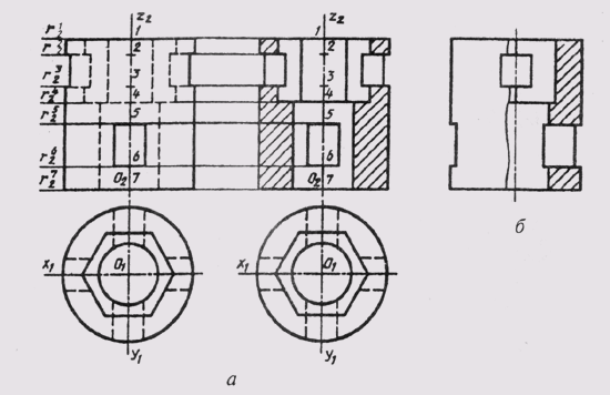отверстиями, из которых одно имеет поверхность правильной шестиугольной призмы, а второе — цилиндрическую поверхность. Нижнее призматическое отверстие пересекает поверхность наружного и внутреннего цилиндра, а верхнее четырехгранное призматическое отверстие пересекает наружную поверхность цилиндра и внутреннюю поверхность шестигранного призматического отверстия.