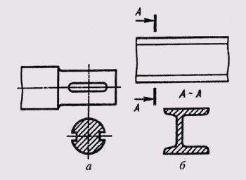 Для несимметричных наложенных сечений или выполненных в разрыве основного изображения, линию сечения со стрелками проводят, но буквами не обозначают (рис. 188, а, б). Наложенное симметричное сечение (см. рис. 187, а), симметричное сечение, выполненное в разрыве основного изображения (см. рис. 187, б), вынесенное симметричное сечение, выполненное по следу секущей плоскости (см. рис. 186, а), оформляют без нанесения линии сечения.