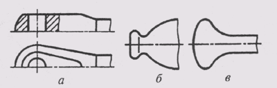 Допускается упрощение изображать линии среза и линии перехода (см. § 67); вместо лекальных кривых проводят дуги окружности и прямые линии (рис. 193, а), а плавный переход от одной поверхности к другой показывать условно (рис. 193, б) или совсем не показывать (рис. 193, в).