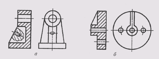 Отверстия, расположенные на круглом фланце и не попадающие в секущую плоскость, показывают в разрезе так, словно они находятся в секущей плоскости (рис. 196, б).