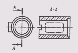 Для сокращения количества изображений допускается часть предмета, расположенную между наблюдателем и секущей плоскостью, изображать штрихпунктирной утолщенной линией (рис. 197).