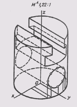 стандартную прямоугольную изометрию изображенного на нем предмета. Воспользуемся приведенными коэффициентами искажения. Примем расположение начала координат (точка О) — в центре нижнего основания предмета (рис. 198). Вычертив оси изометрии и установив масштаб изображения (МА 1,22: 1), отмечаем центры окружностей верхнего и нижнего оснований цилиндра, а также окружностей, ограничивающих Т-образный вырез. Вычерчиваем эллипсы, являющиеся изометрией окружностей (см. § 77). Затем проводим линии, параллельные координатным осям, которые ограничивают вырез в цилиндре. Изометрию линии пересечения сквозного цилиндрического отверстия, ось которого