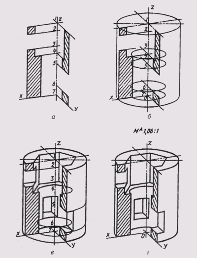 Для построения аксонометрического изображения предмета с учетом разреза воспользуемся условиями задачи, решение которой отражено на рис. 185, а. На заданном чертеже для построения наглядного изображения отметим положение проекций координатных осей и на сои Oz отметим центры 1,2,..., 7 фигур предмета, расположенных в горизонтальных плоскостях Г1', Т"2, ...,Г7', это верхнее и нижнее основания предмета, основания внутренних отверстий. Для передачи внутренних форм предмета выполним вырез1/4 части предмета координатными плоскостями xOz и yOz.