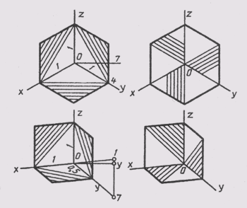 Построение наглядного изображения начинаем с проведения осей диметрии и указания масштаба МА 1,06: 1 (см. § 78). На оси z отмечаем положение центров 1, 2,..., 7 (рис. 199, а); расстояния между ними берем с главного вида предмета. Через отмеченные точки проводим оси диметрии. Затем строим в диметрии фигуры сечения сначала в плоскости xOz, а затем в плоскости yOz. Размеры координатных отрезков берем с комплексного чертежа (рис. 185); при этом размеры по оси у сокращаем в два раза. Выполняем штриховку сечений. Угол наклона линий штриховки в аксонометрии определяется диагоналями параллелограммов, построенных на аксонометрических осях с учетом коэффициентов искажения. На рис. 200, а приведен пример выбора направления штриховки в изометрии, а на рис. 200, б — в диметрии. Далее строим эллипсы — диметрию окружностей, расположенных в горизонтальных плоскостях (см. рис. 199, б). Проводим контурные линии наружного цилиндра, внутренних вертикальных отверстий, строим основание этих отверстий (рис. 199, в); вычерчиваем видимые линии пересечения горизонтальных отверстий с наружной и внутренними поверхностями.