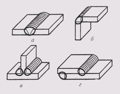 По способу взаимного расположения свариваемых деталей различают соединения стыковые (рис. 242, а), угловые (рис. 242, б), тавровые (рис. 242, в) и внахлестку (рис. 242, г). Вид соединения определяет вид сварного шва. Сварные швы подразделяются на: стыковые, угловые (для угловых, тавровых соединений и соединений внахлестку), точечные (для соединений внахлестку, сваркой точками).