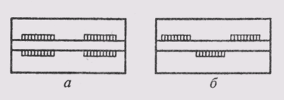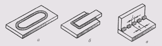 По своей протяженности сварные швы могут быть: непрерывными по замкнутому контуру (рис. 243, а) и по незамкнутому контуру (рис. 243, б) и прерывистыми (рис. 243, в). Прерывистые швы имеют равные по длине проваренные участки с равными промежутками между ними. При двусторонней сварке, если заваренные участки расположены друг против друга, такой шов называется цепным (рис. 244, а), если же участки чередуются, то шов называется шахматным (рис. 244, б).