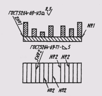 При наличии на чертеже нескольких одинаковых швов обозначение наносят только одного шва, и поэтому шву присваивают порядковый номер с указанием количества этих швов у линии-выноски. Все остальные швы этого типа имеют на полке линии-выноски обозначение порядкового номера шва (рис. 248), если указана лицевая сторона шва, и под полкой линии-выноски, если указана оборотная сторона шва. На рис. 248 обозначение № 1 два угловых шва, выполненные ручной электродуговой сваркой, с лицевой стороны усиление шва нужно снять Q механической обработкой, после чего шероховатость шва должна соответствовать шестому классу (Ra = 2,5 мкм).