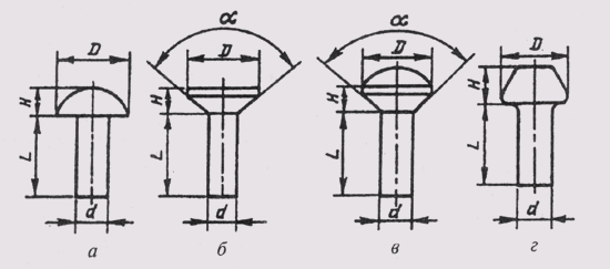 скую или коническо-сферическую форму. В зависимости от этого различают головки полукруглые (рис. 249, а), потайные (рис. 249, б), полупотайные (рис. 249, в), плоские (рис. 249, г).