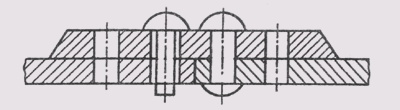 Технология выполнения заклепочного соединения следующая. В соединяемых деталях выполняют отверстия сверлением или другим способом. В сквозное отверстие соединяемых деталей вставляют до упора головной стержень заклепки. Причем заклепка может быть в горячем или холодном виде. Свободный конец заклепки выходит за пределы детали примерно на 1 ,5d. Его заклепывают ударами или сильным давлением и создают вторую головку (рис. 250).