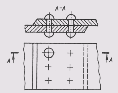 На чертежах указывают все конструктивные размеры швов клепаного соединения. При этом не вычерчивают все заклепки соединения. Обычно показывают одну-две из них, а место расположения остальных обозначают пересечением осей (рис. 251).