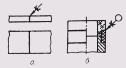 Припой на видах и разрезах изображают сплошной линией толщиной 2S. Для обозначения пайки используют условный знак (рис. 252, а)— дуга выпуклостью к стрелке, который чертят на линии-выноске, указывающей паяный шов. Если шов выполняется по периметру, то линию-выноску заканчивают окружностью. Номер швов указывают на линии-выноске (рис. 252, б).