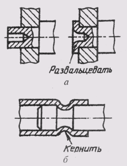 Вальцовка и кернение осуществляется деформацией соединяемых деталей (рис. 255, а, б). Сшивание нитками, металлическими скобками применяется для соединения бумажных листов, картона, различных тканей.