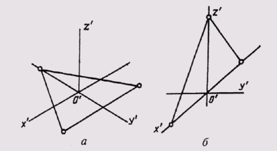 На рис. 297, а приведен технический рисунок прямоугольного треугольника, расположенного в горизонтальной плоскости проекций и выполненный в прямоугольной изомерии, а на рис. 297, б — технический рисунок прямоугольного треугольника, расположенного во фронтальной плоскости проекций и выполненного в прямоугольной диметрии.