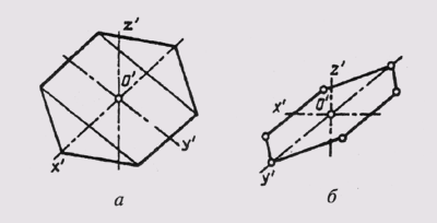 На рис. 298, а показан технический рисунок шестиугольника, расположенного в горизонтальной плоскости проекций и выполненного в прямоугольной изометрии. На рис. 298, б приведен технический рисунок того же шестигранника, выполненный в прямоугольной диметрии. Точно так же выполнен рисунок окружности, расположенной в