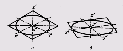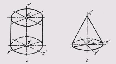 Выполнение технических рисунков поверхностей вращения связано с построением эллипсов. На рис. 301, а приведен технический рисунок прямого кругового цилиндра, выполненный в прямоугольной изомерии, а на рис. 301, б — рисунок прямого кругового конуса, выполненный в прямоугольной диметрии.