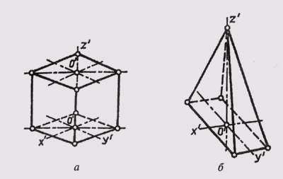 На рис. 300, а приведен технический рисунок прямой четырехгранной пирамиды, выполненный в прямоугольной изомерии, на рис. 300, б — технический рисунок прямой четырехгранной пирамиды, выполненный в прямоугольной диметрии.