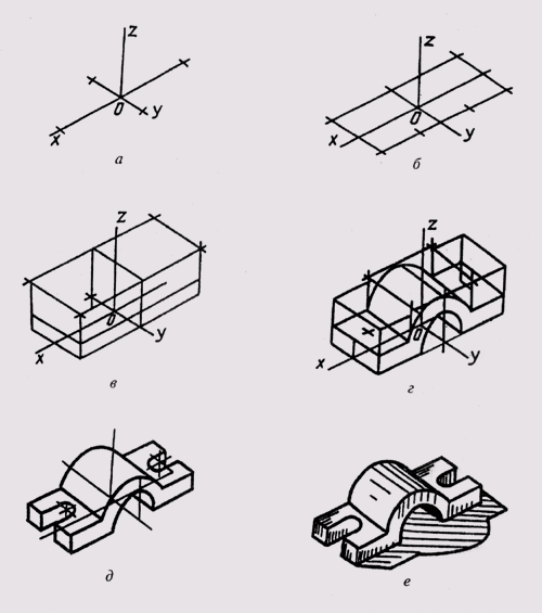 5. Выбирают способ оттенения и выполняют соответствующую дорисовку технического рисунка (рис. 302, е). На рис. 302 показана последовательность построения технического рисунка ттетели.