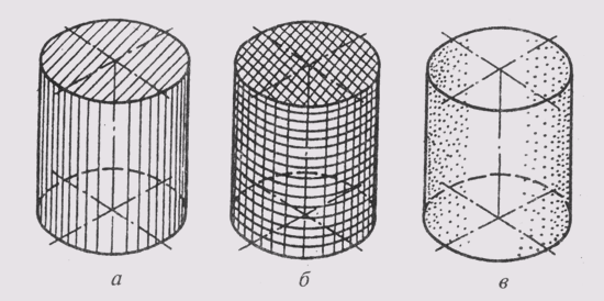На рис. 303, а приведен технический рисунок цилиндра, на котором оттенение выполнено параллельной штриховкой, на рис. 303, б — траферовкой, а на рис. 303, в — с помощью точек. На рис. 302, е показан технический рисунок детали с оттенением, выполненным параллельной штриховкой.