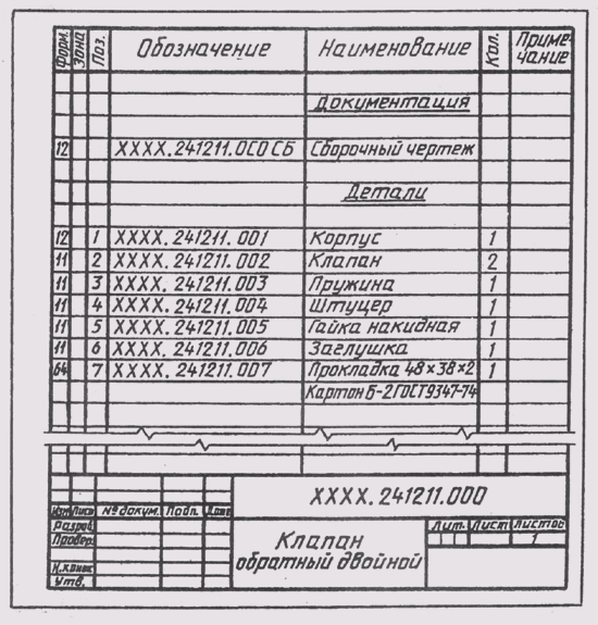 На рис. 321 выполнен сборочный чертеж обратного двойного клапана, спецификация к нему — на рис. 322.