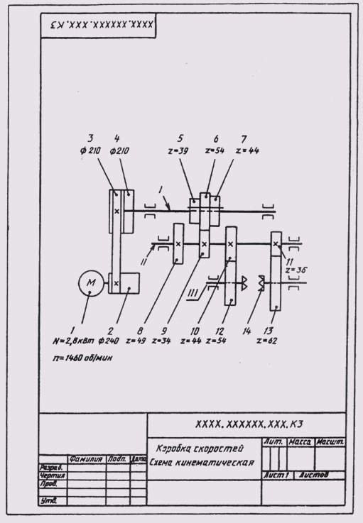 Читать кинематическую схему начинают от двигателя, выявляя последовательно по условным обозначениям каждый элемент кинематической цепи, устанавливая его значение и характер передачи движения. Чтение схемы рекомендуется начинать с изучения паспорта данного механизма. На рис. 331 изображена кинематическая схема коробки скоростей токарного станка.