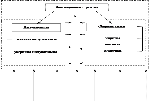 Очень интересны выводы, сделанные группой российских экономистов по результатам исследования зарубежного опыта инновационного менеджмента. Они выделяют два основных класса инновационной стратегии: оборонительную и наступательную. При этом каждый класс включает несколько типов стратегий (рис. 3.1), которые выбираются предприятием в зависимости от условий микро- и макросреды.