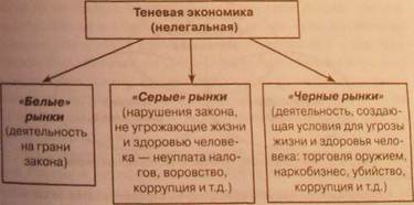 Таким образом, термины «белая», «серая», «черная» экономика употребляются для характеристики отдельных видов деятельности в рамках теневой экономики, различающихся по степени их законности' (легальности).
