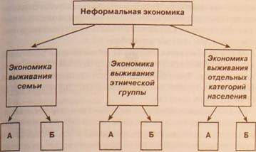 Исходя из вышеприведенной схемы, неформальную экономику можно подразделить на несколько секторов — экономика выживания семьи, экономика выживания этнических меньшинств, экономика выживания отдельных категорий населения.