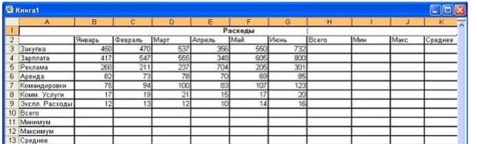 На первом рабочем листе создайте электронную таблицу Расходы коммерческой фирмы с данными согласно электронной таблице, представленной на Рис. 1, и с помощью формул выполните вычисления.