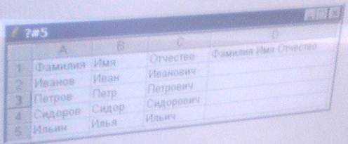 7) на рисунке представлена Таблица в окне активной книги приложения Microsoft Excel. В ячейку D2 записана функция объединения Имени, Отчества и Фамилии в одной ячейке D2.